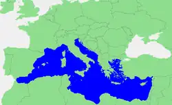 Mediterane togo bora Latinkan na mediterraneus "dogukolo cema" (kabo medius la "cemala" ani terra "dugukolo". A be datugunike masuruyala bametri kene 2.5 (milu kene 965000) nka tuguyoro Atlantik la Gibraltari Damoso ye bametri 14 doron ye (milu 9).